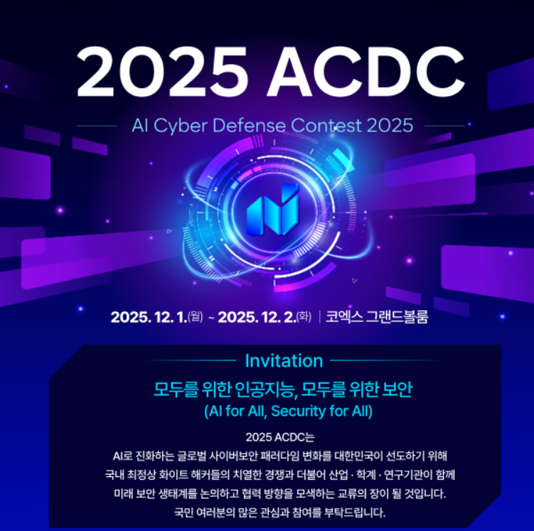 행사소개 : AI로 진화하는 글로벌 사이버보안 패러다임 변화를 대한민국이 선도하기 위해 국내 최정상 화이트 해커들이 치열한 경쟁과 더불어 산업·학계·연구기관이 함께 미래 보안 생태계를 논의하고 협력 방향을 모색하는 행사입니다. |